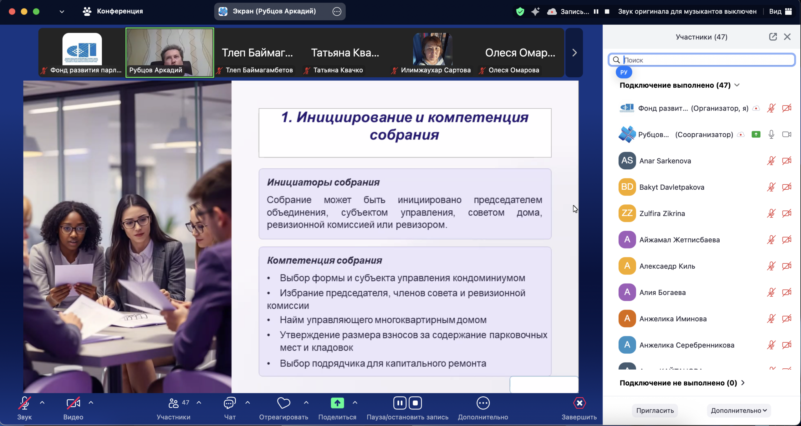 Организаторами вебинаров выступили партнёры проекта из Астаны — Фонд развития парламентаризма в Казахстане (ФРПК). Они также являлись докладчиками и в основном представили темы, связанные с государственной политикой в сфере развития гражданского общества, законотворчеством и участием ОГО в законодательном процессе. Партнёры из Алматы и Петропавловска выступали по темам жилищного самоуправления как элемента гражданского участия и публичной политики, по последним изменениям жилищного законодательства и другим актуальным для НКО вопросам, таким как «Менеджмент, миссия и планирование деятельности», «Визуализация и современное представление работы НКО» «Вовлечение жителей в программу ´Бюджет народного участия´» и др. Партнёры из Берлина отвечали за блок, посвящённый повышению энергоэффективности МЖД. Помимо собственных презентаций, они привлекли специалистов из Германии, стран Балтии и Казахстана.
