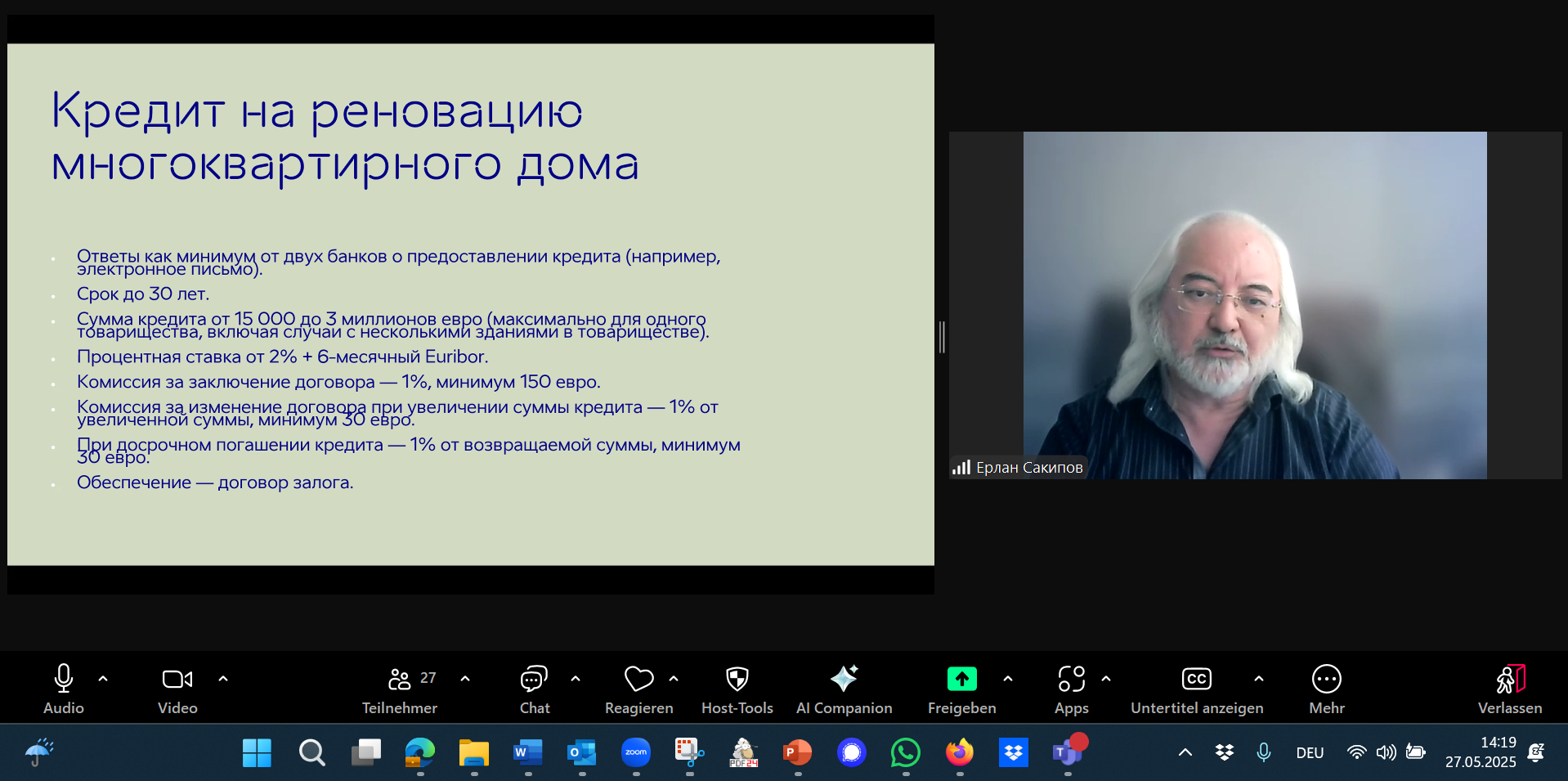 Фото 4. Активный участник ТоТ 2024-25гг., Ерлан Сакипов, ТОО «АРХИпелаг», г.Алматы ─ большой интерес вызвала тема «Программа финансирования энергетической модернизации МЖД в Эстонии, вебинар 27.05.2025. ©IWO